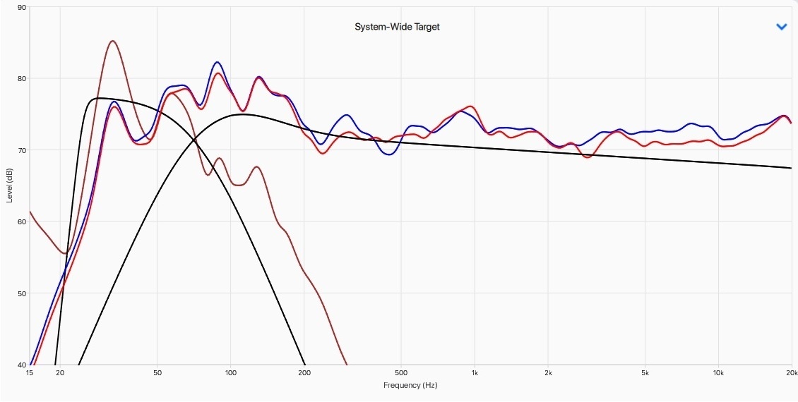 Obr. 4 – Naměřené výsledky systémem ARC Genesis (Anthem) – levý a pravý kanál DALI Opticon 8 Mk2 (modrá a červená) ve spojení se subwooferem T/9x (hnědá). Cílová korekce, které je potřeba dosáhnout, je vyznačena černě.