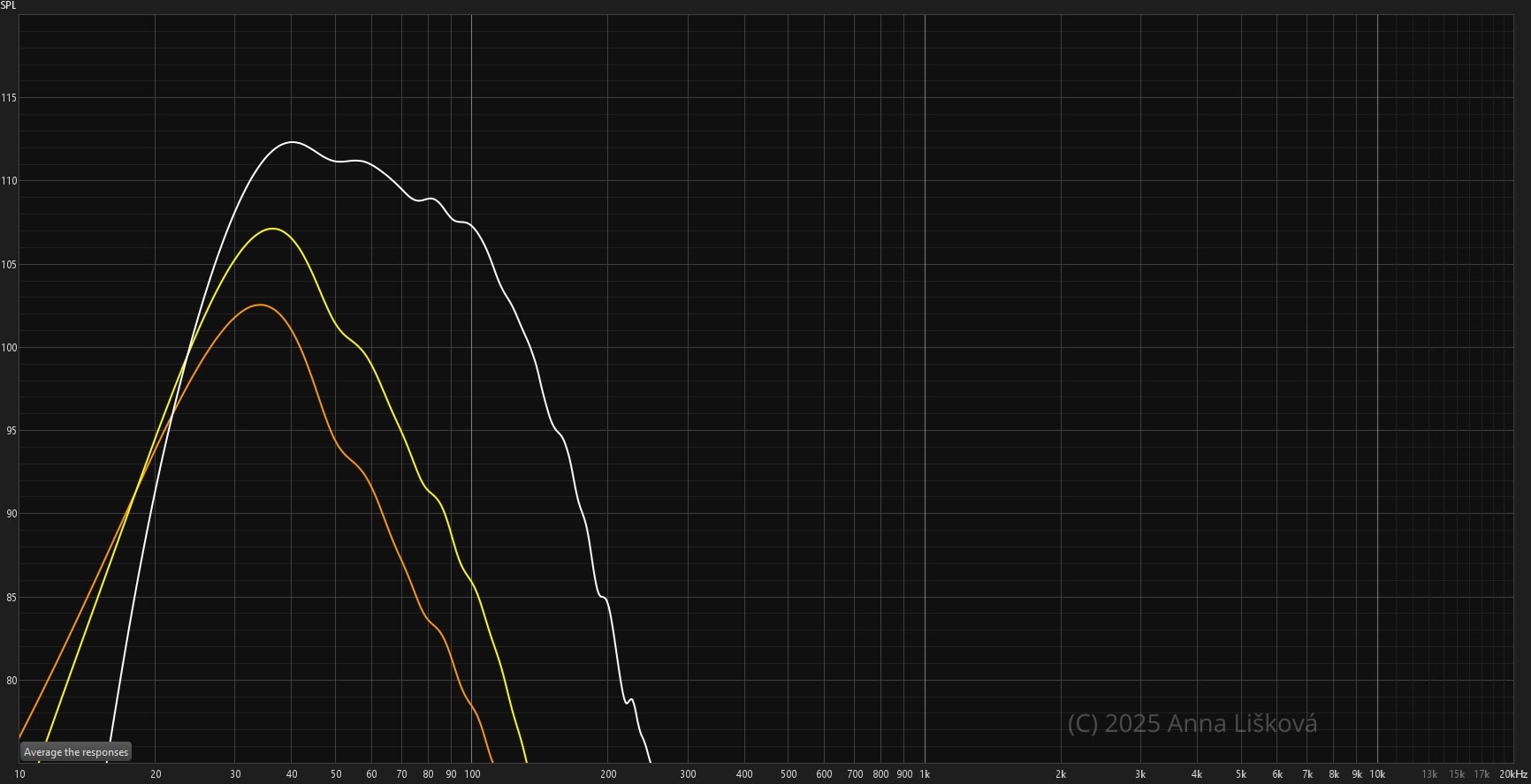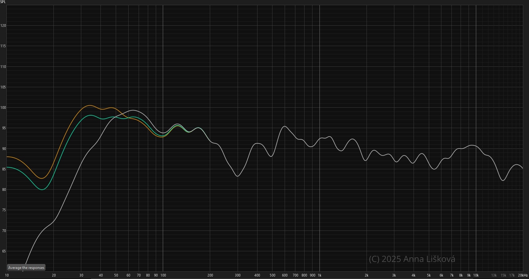 Výsledky v grafu ukazují, že frekvenční průběh subwooferu nemá typicky učebnicovou podobu – ve všech případech
