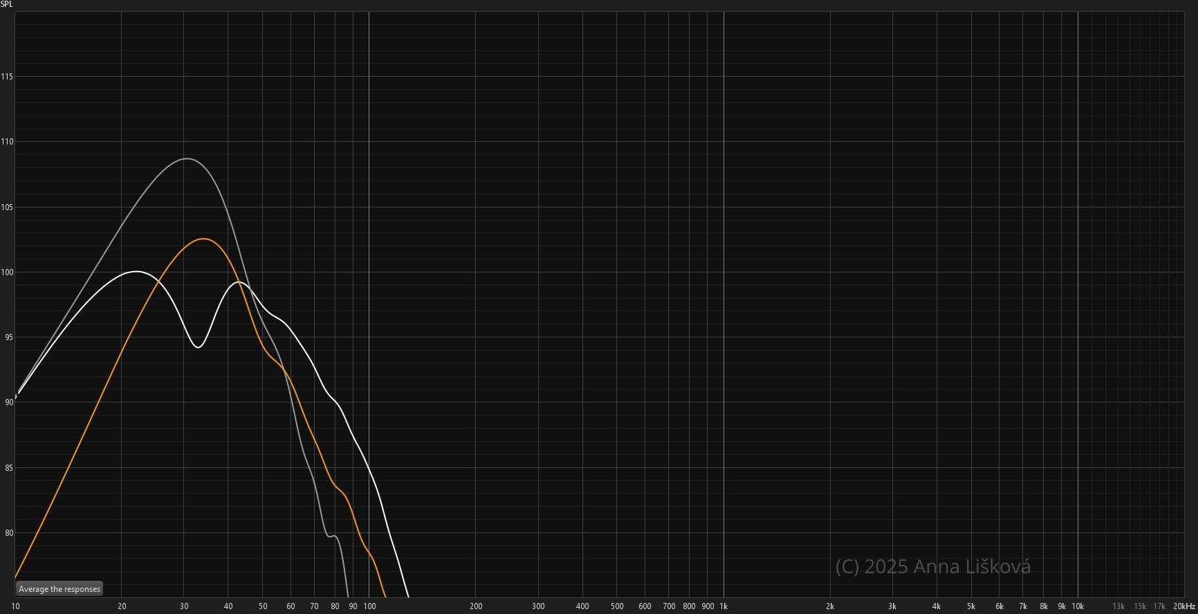 Obr. 1 - Frekvenční charakteristika subwooferu T/9x (změřená metodou quasi-anechoic), dělicí frekvence nastavena na 30Hz. Hlavní basový měnič (bílá), pasivní radiátor (šedá), výsledné chování subwooferu jako celku (oranžová).