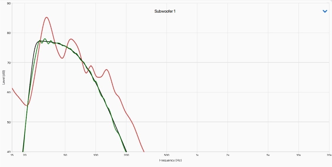 Obr. 5 – Ukázka amplitudové korekce u subwooferu T/9x v systému ARC Genesis – naměřené chování v poslechovém prostoru (červená), požadovaný výsledek (černá), výsledek po úpravě (zelená).
