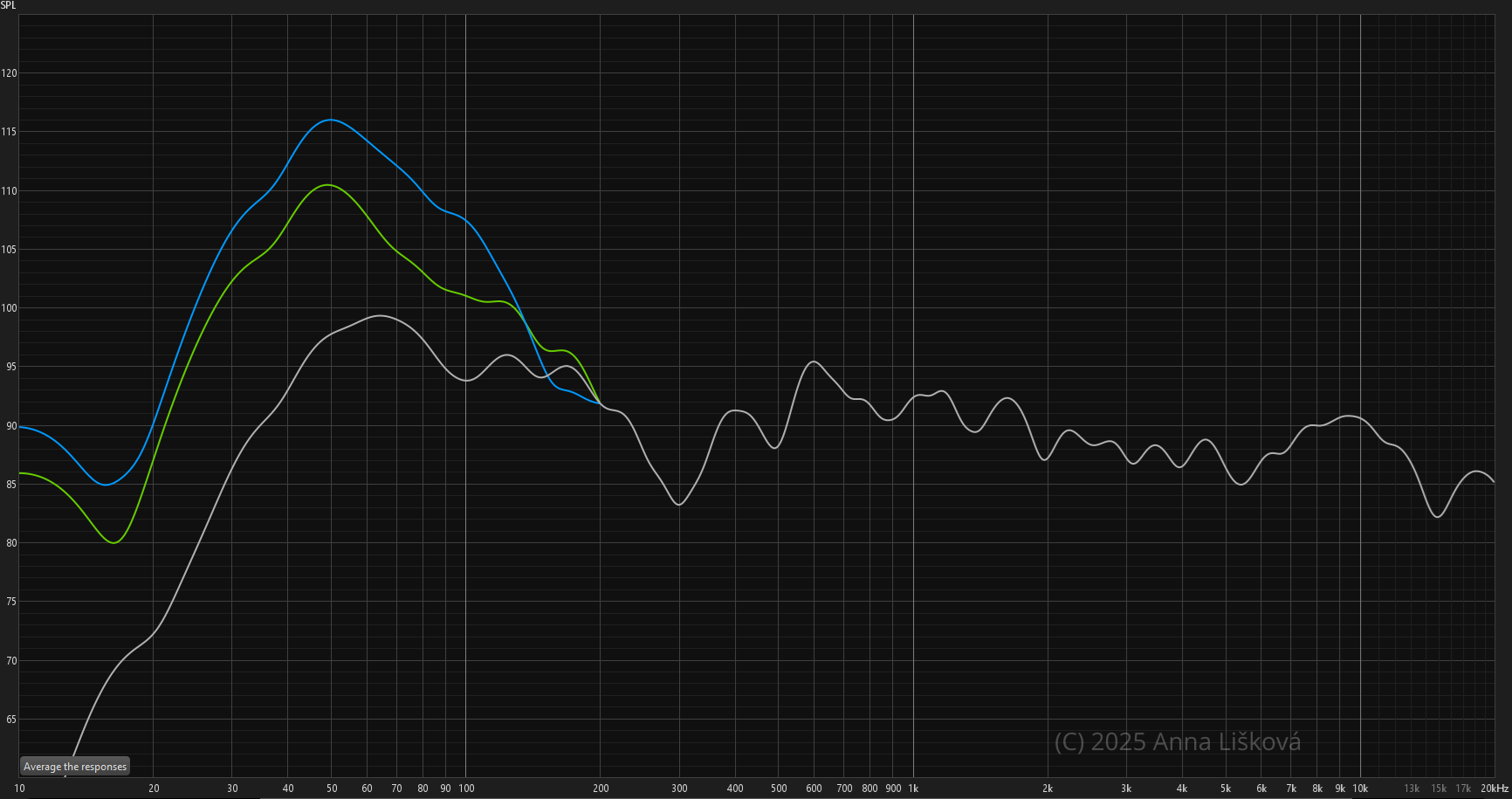 citlivost přibližně na 1/3 rozsahu. Šedá – samotné reprosoustavy bez subwooferu, zelená – přepínač fáze