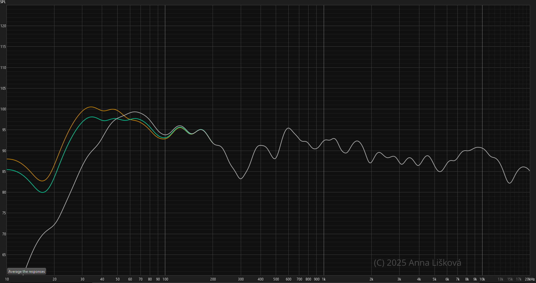 Obr. 7 – finální výsledek sladění QR1 SE a REL T/9x, dělicí frekvence subwooferu nastavena na 30 Hz, přepínač fáze nastaven na 180°. Šedá – samotné reprosoustavy bez subwooferu, tyrkysová – o 1 krok vstupní citlivosti méně, oranžová – o 2 kroky vstupní citlivosti více (oproti původní 1/3 rozsahu).
