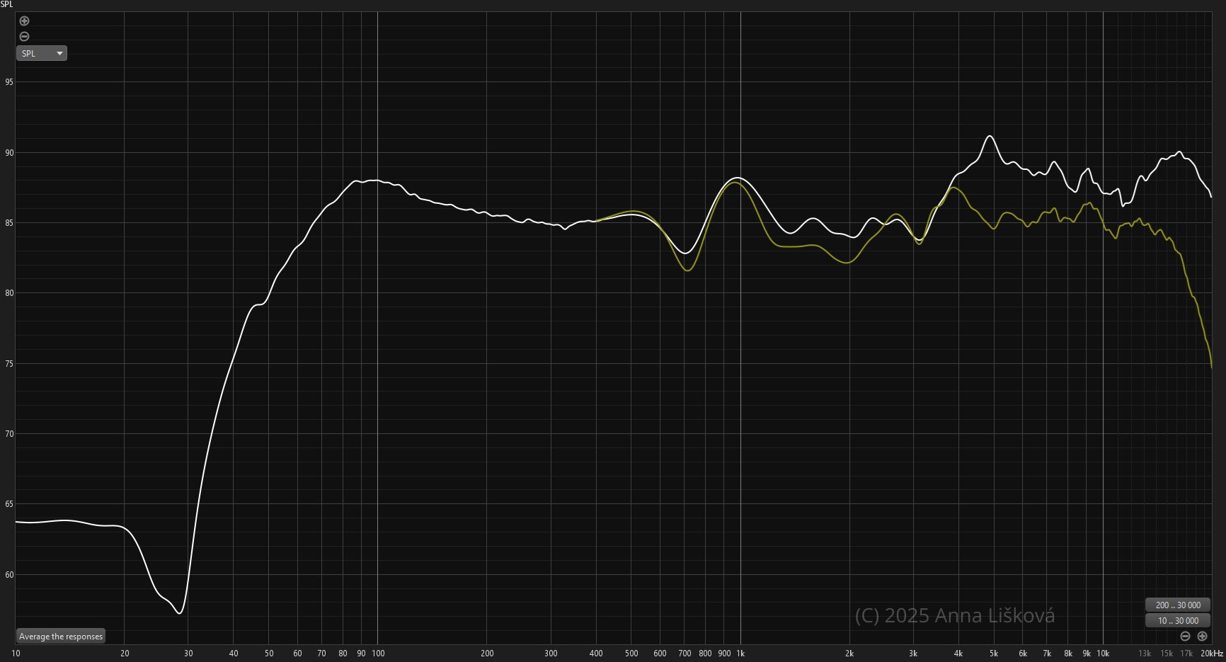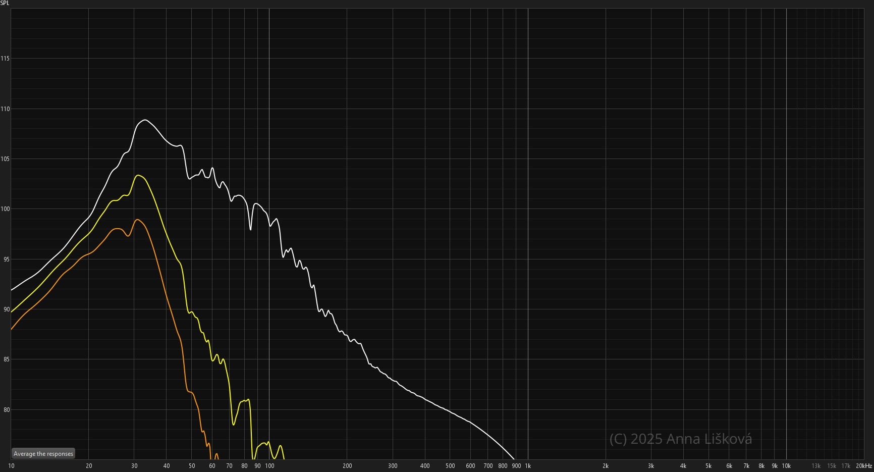 Obr. 4 – frekvenční charakteristiky subwooferu REL T/9x s nastavením dělicí frekvence na 30 Hz (oranžová), uprostřed rozsahu regulátoru (žlutá) a na 120 Hz (bílá). Přirozeným chováním filtru, v kombinaci s basovým měničem – dochází při snižování dělicí frekvence i k poklesu citlivosti, k dosažení optimálního výsledku je tedy potřeba si pohrát s oběma regulátory.