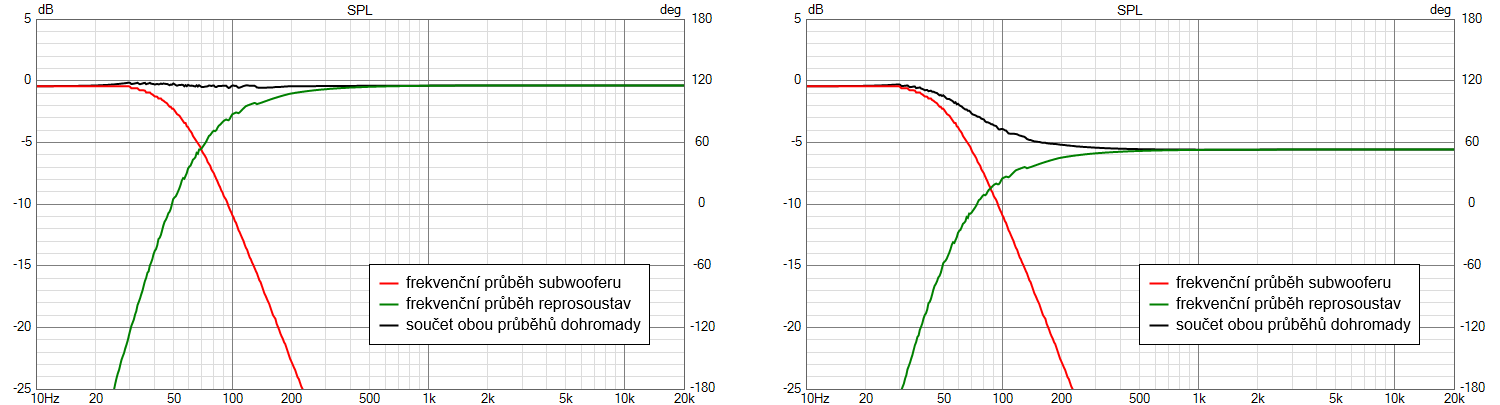 subwooferu, zelená křivka znázorňuje chování reprosoustav a černá je výslednicí, která sečtením obou průběhů