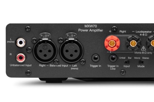 Výkonový zesilovač kompaktních rozměrů Cambridge Audio MXW 70 s výkonem 2 x 125 W / 4 Ω ve třídě D. V můstkovém režimu mono výkon 250 W / 8 Ω. Vstupy nesymetrické RCA-Cinch a symetrické XLR. 1 pár šroubovacích reproterminálů. Vstup ovládacího napětí Trigger 12 V.