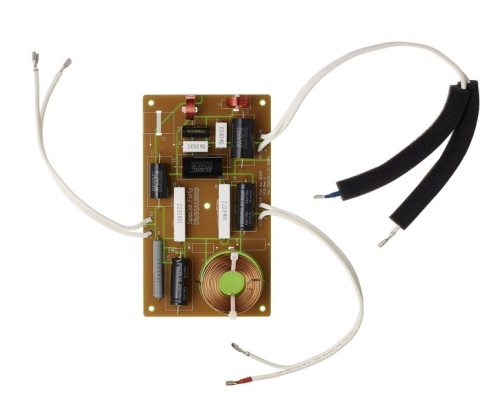 K rozdělení kmitočtočtového pásma pro výškový a basový měnič bylo použito výhybky klasické konstrukce prvního