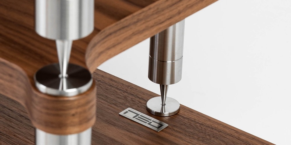 DOUBLE TRIPOD je robustní modulární audio rack, do kterého lze umístit dva komponenty plné šířky vedle sebe a proto je vhodný i pro umístění pod televizor. Stabilní základna je sestavena z desky MDF o síle 29 mm a je v osazena pěti nosníky zakončené hroty. Tři nohy jsou na přední straně a dvě vzadu. Jedno patro má nostnost 60 kg. Další policové díly v pěti výškových variantách se postupně skládají na sebe. K dispozici jsou ve výšce 122 mm, 172 mm, 222 mm, 272 mm a 322 mm, což umožňuje širokou flexibilitu při sestavování racku přesně podle rozměrů vašich hi-fi komponentů. Nohy jsou vyrobeny z kulatiny z nerezové oceli o průměru 40 mm v přirozené barvě kovu, nebo na přání tmavé ve verzi LUXURY BLACK DIAMOND. Hroty, do sebe zapadajících nosníků, absorbují nežádoucí přenos vibrací, které negativně ovlivňují poslech. Základní nabídka polic zahrnuje dvě varianty v bílém a černém matném provedení, společně s přírodní ořechovou dýhou. Milovníky designu potěší varianta INDIVIDUAL ve které si zákazník vybírá svůj vlastní vzhled. Na výběr jsou všechny evropské i exotické dýhy, všechny odstíny RAL a další různorodé luxusní povrchy, čímž lze rack individuálně na přání vhodně zvoleným povrchem přizpůsobit vzhledu reprosoustav, nebo designu interiéru.